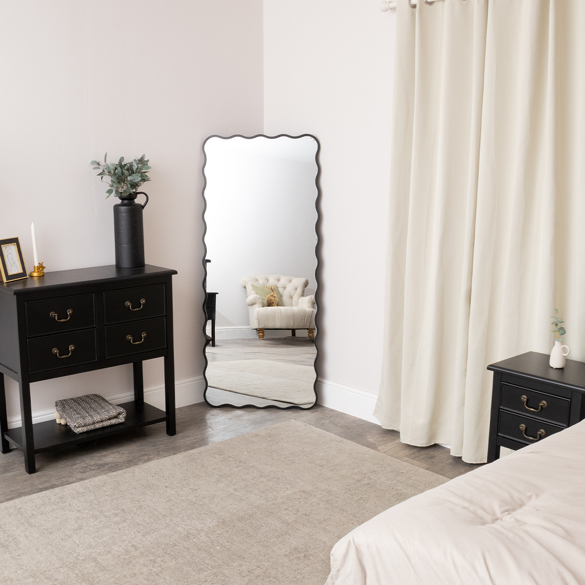This Black 4 Drawer Large Chest/Console Table with Shelf from the Briggs Range is a beautiful, contemporary storage piece, ideal for fans of minimalist design and unique detailing. Made of manufactured wood and metal, this chest comes with 4 storage drawers and a display shelf. It has a painted black finish on the front and antique metal handles.