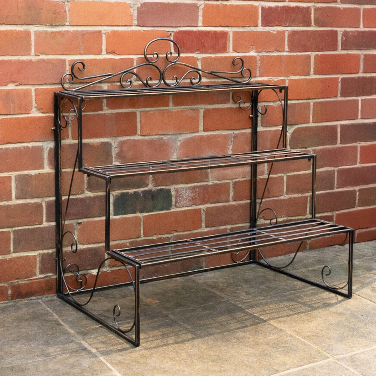This Black & Gold Metal Three Tier Plant Theatre Stand is a pretty piece of outdoor display decor and a great choice for lovers of black & gold accessories! Made of metal, this plant theatre has a three tiered shelving design, it comes with curved, ornate detailing and a dark coloured painted finish.