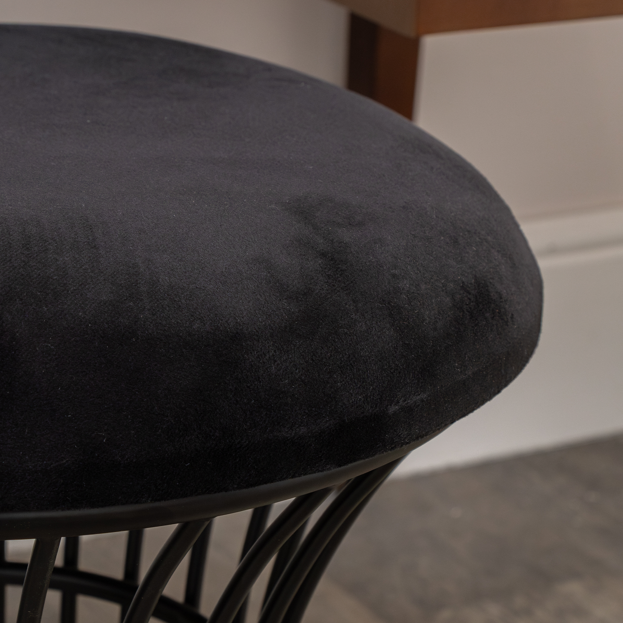 This Black Metal Detailed Upholstered Dressing Table Stool is a stylish, vintage inspired seating choice, perfect for fans of unique furniture. Crafted from metal, this has a classic stool design and comprises of spiral legs connected with supports for sturdiness and a round black velvet seat.