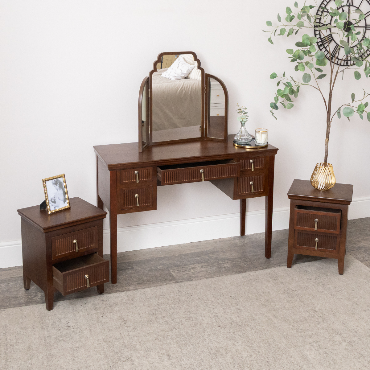 Dark Brown Wooden Reeded Dressing Table, Mirror Set & Pair of Bedside Tables - Georgian Range