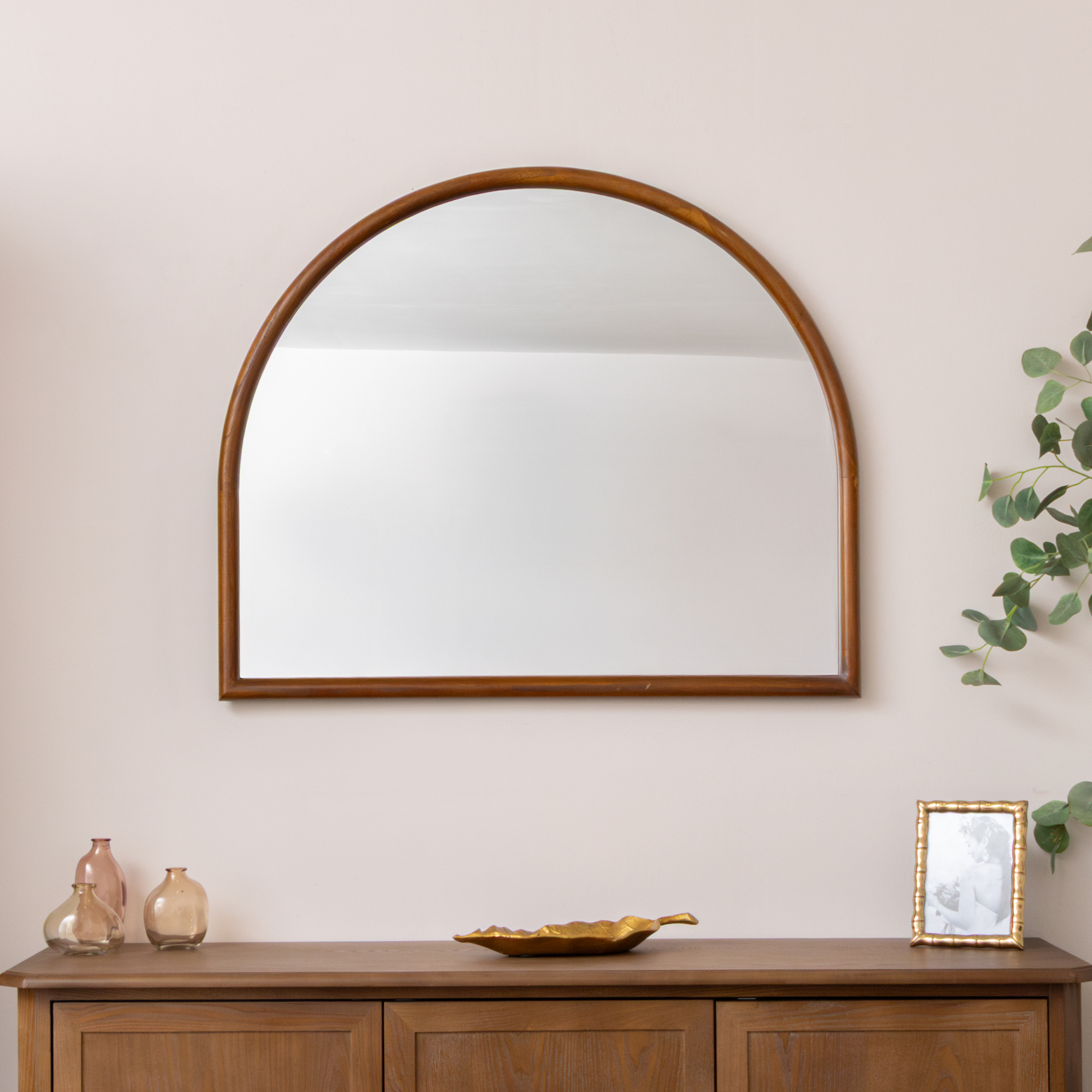 A stylish wall mirror that would blend perfectly into rustic, farmhouse, vintage or neutral interiors. Due to its versatile size and arched shape, this mirror would make a statement in any space.