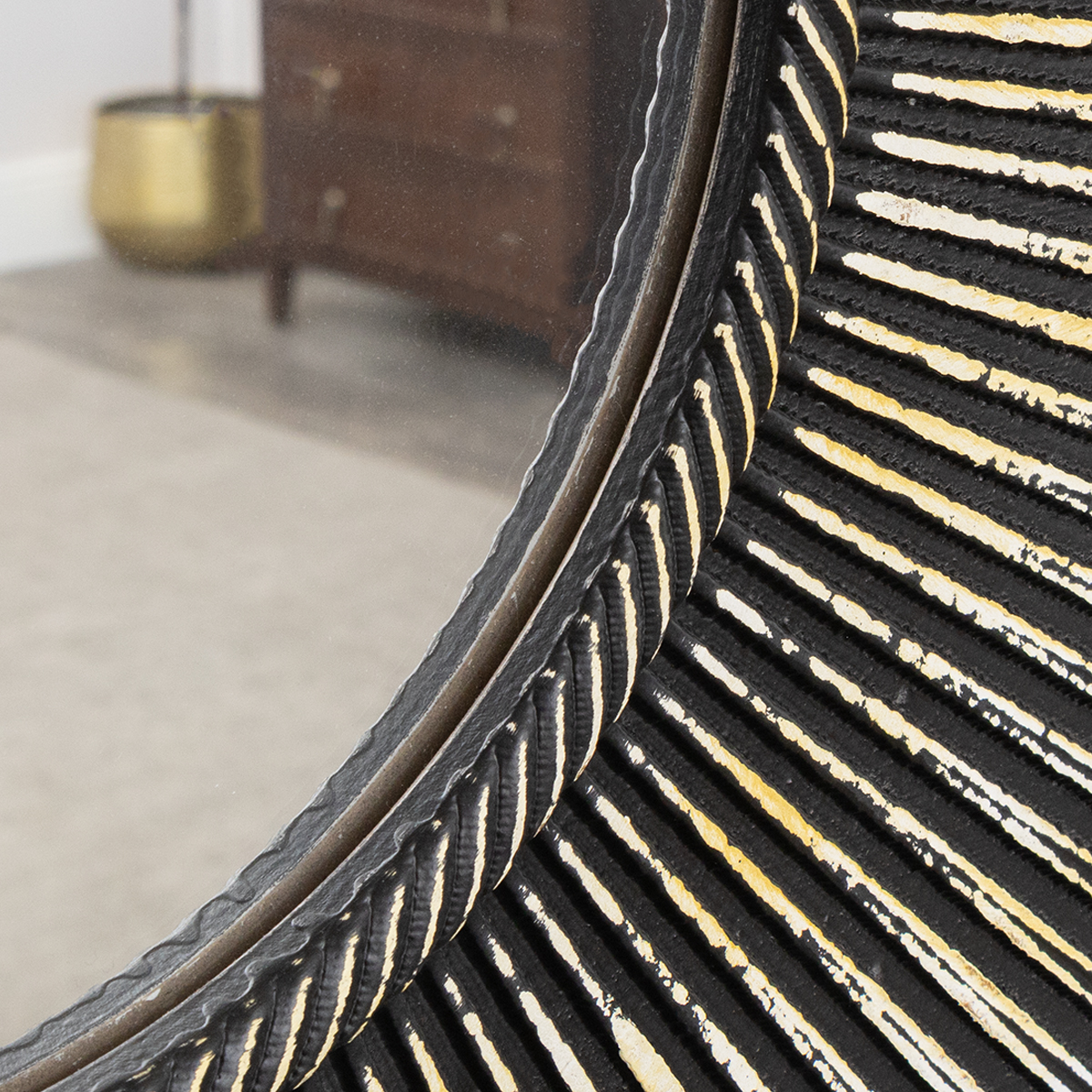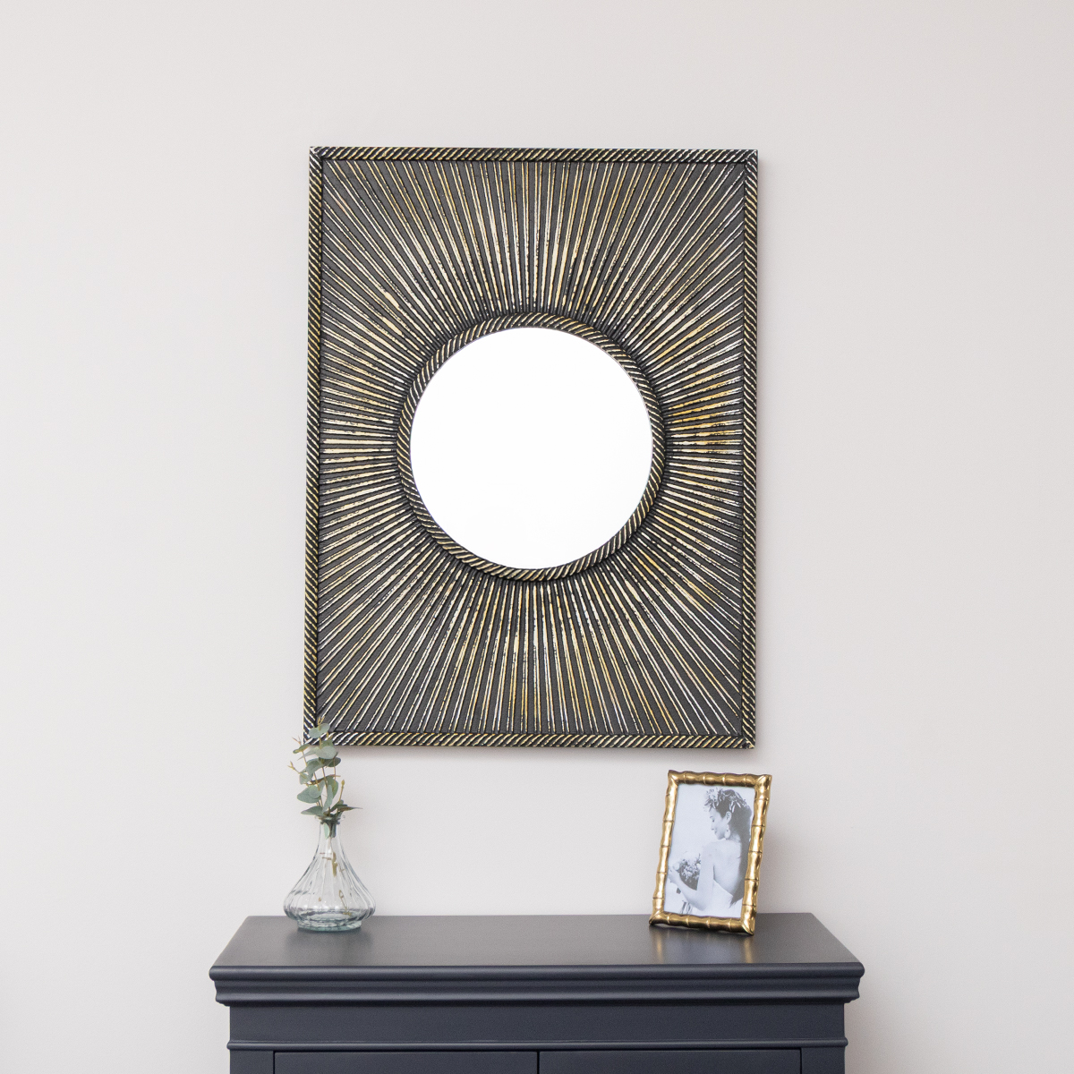 This Distressed Black Rectangular Wooden Sunburst Wall Mirror 60cm x 80cm is a stylish, eye catching wall mirror, perfect for lovers of art deco inspired design and gold decor. Made of metal, glass and wood, this mirror has a classic sunburst inspired design and comes with an antique gold finish.