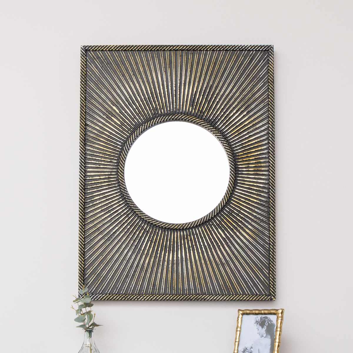 Distressed Black Rectangular Wooden Sunburst Wall Mirror - 60cm x 80cm