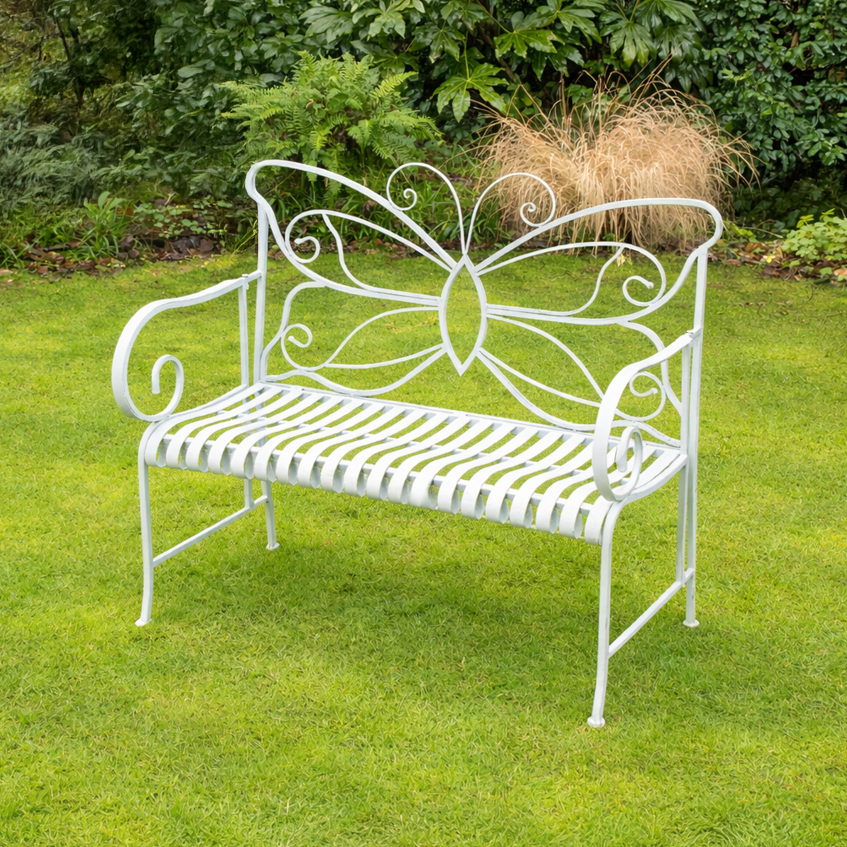 This Grey Metal Butterfly Garden Bench would make the perfect addition to your outdoor garden space or patio area. Made of metal, this bench has a vintage design with a curved butterfly, ornate detailing and a distressed, grey finish.