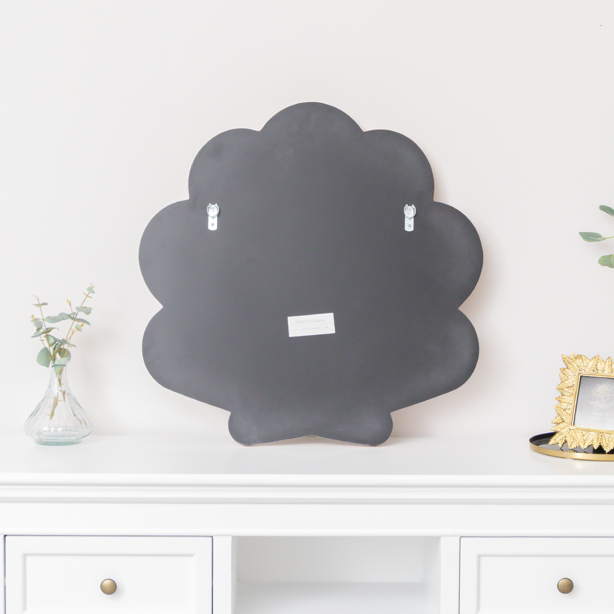 This Large Pink Shell Shaped Wall Mounted Mirror 60cm x 60cm is a stylish, contemporary inspired wall mirror, perfect for fans of colourful decor and quirky design. Made of wood, glass and metal, this mirror has a thin shell framed design and comes with a soft pale pink finish. It can be wall mounted both portrait and landscape via hooks on the back.