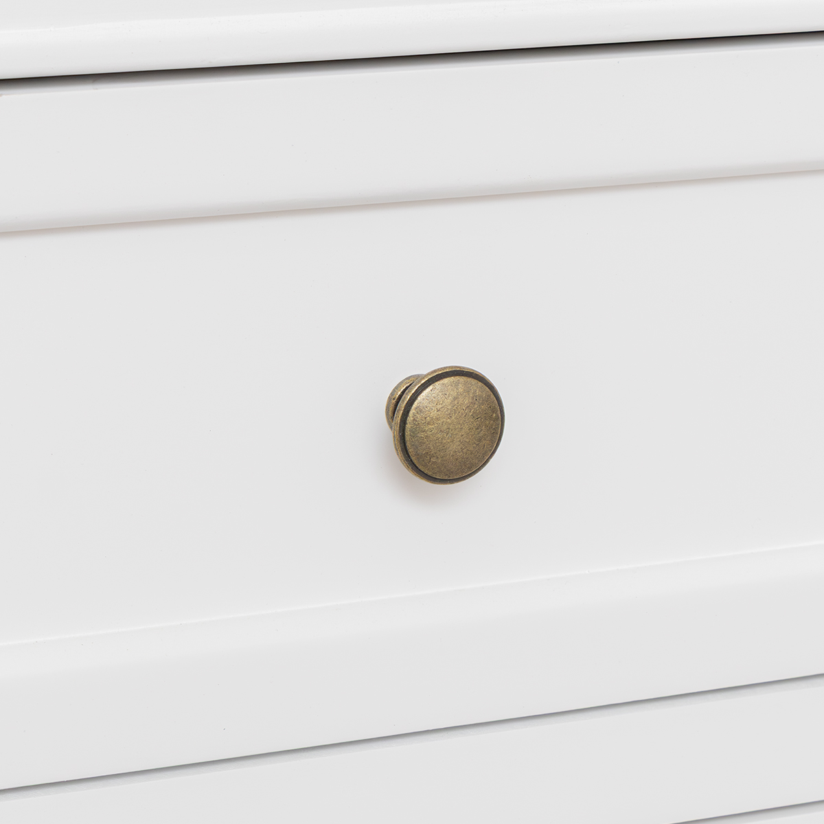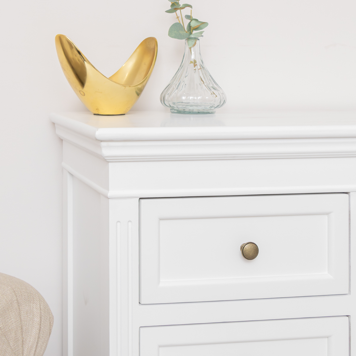 Made of wood, this chest has a vintage inspired Georgian design and comes with simple grooved detailing and rounded brass style handles. It comes complete with a White painted finish.