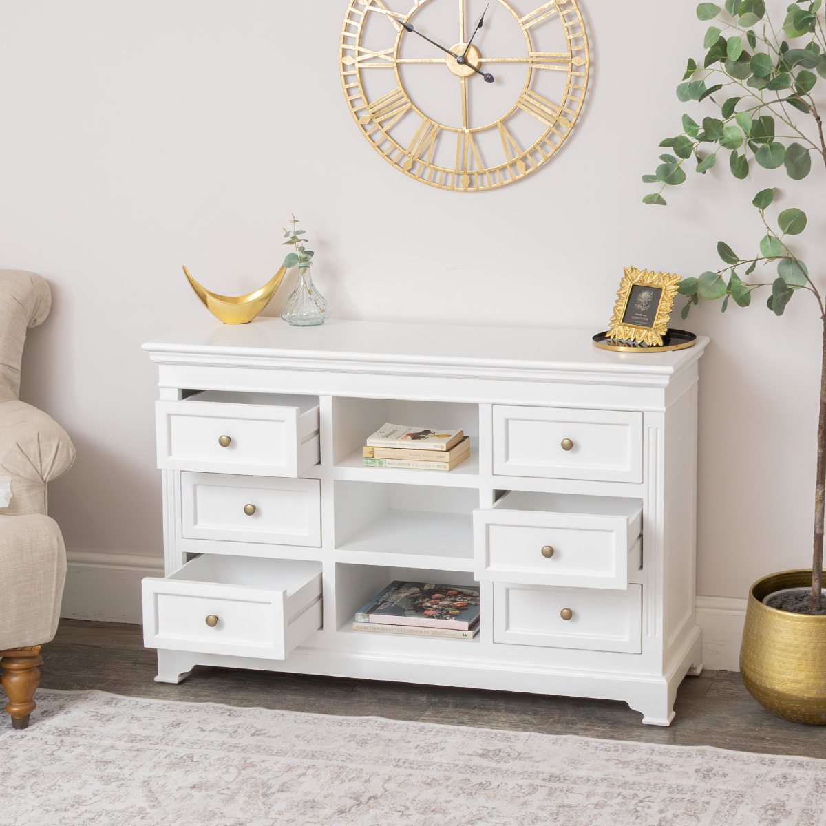 This Large White Wooden Sideboard Cabinet from the Daventry White Range is a classic Georgian style that offers a fantastic storage solution for bedrooms, hallways or living rooms. Hand painted in a neutral White that will suit many interior styles.
