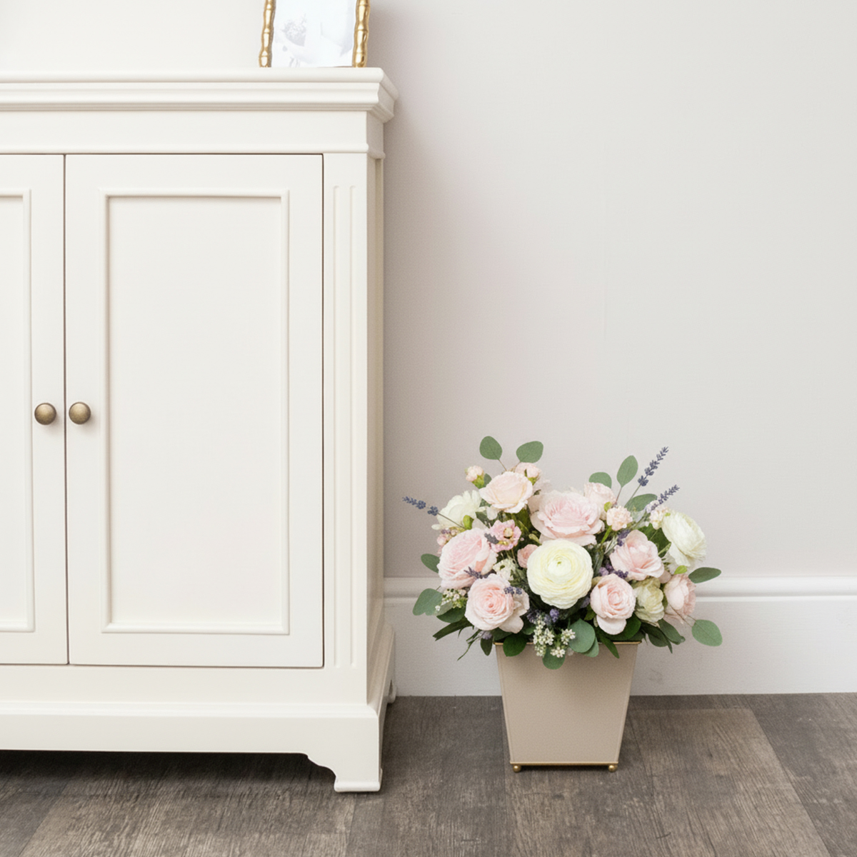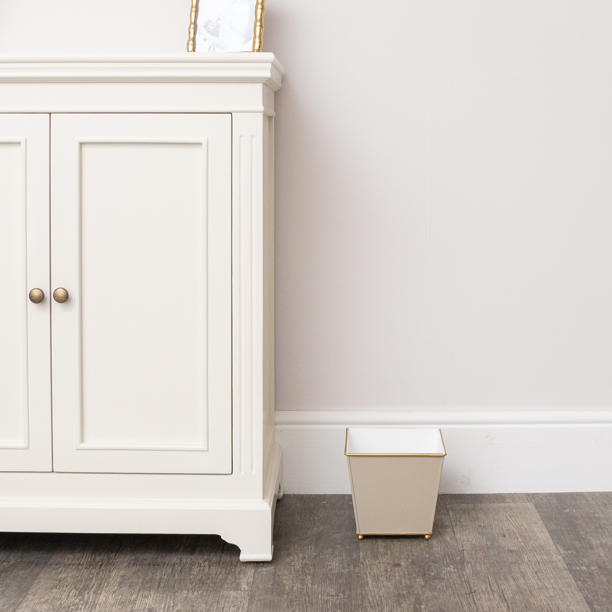 This Sandy Beige Metal Planter Pot with Gold Feet is a neutral inspired storage choice, ideal for storing away your throws, toys, cushions, towels & plants. Made of painted iron, this planter has a rectangle shape and comes with small Gold feet.