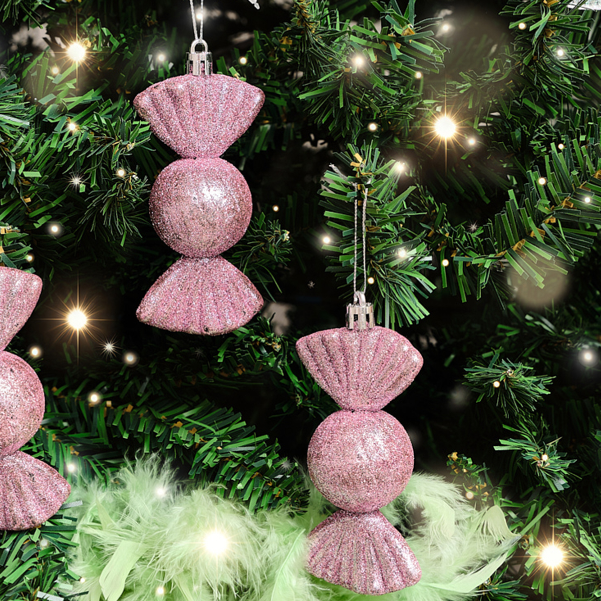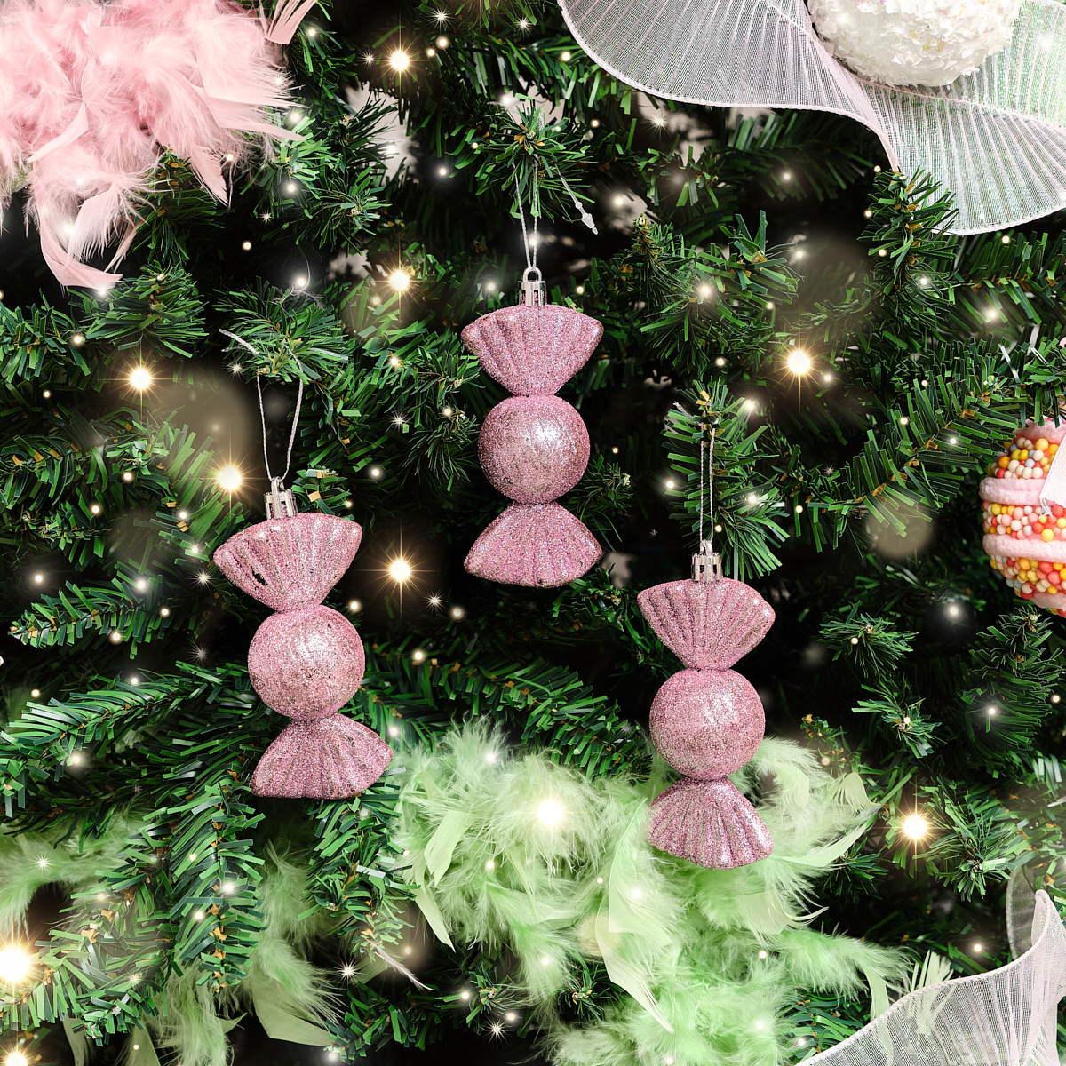Set of 3 Pink Glitter Sweet Shaped Bauble Decorations - 11cm