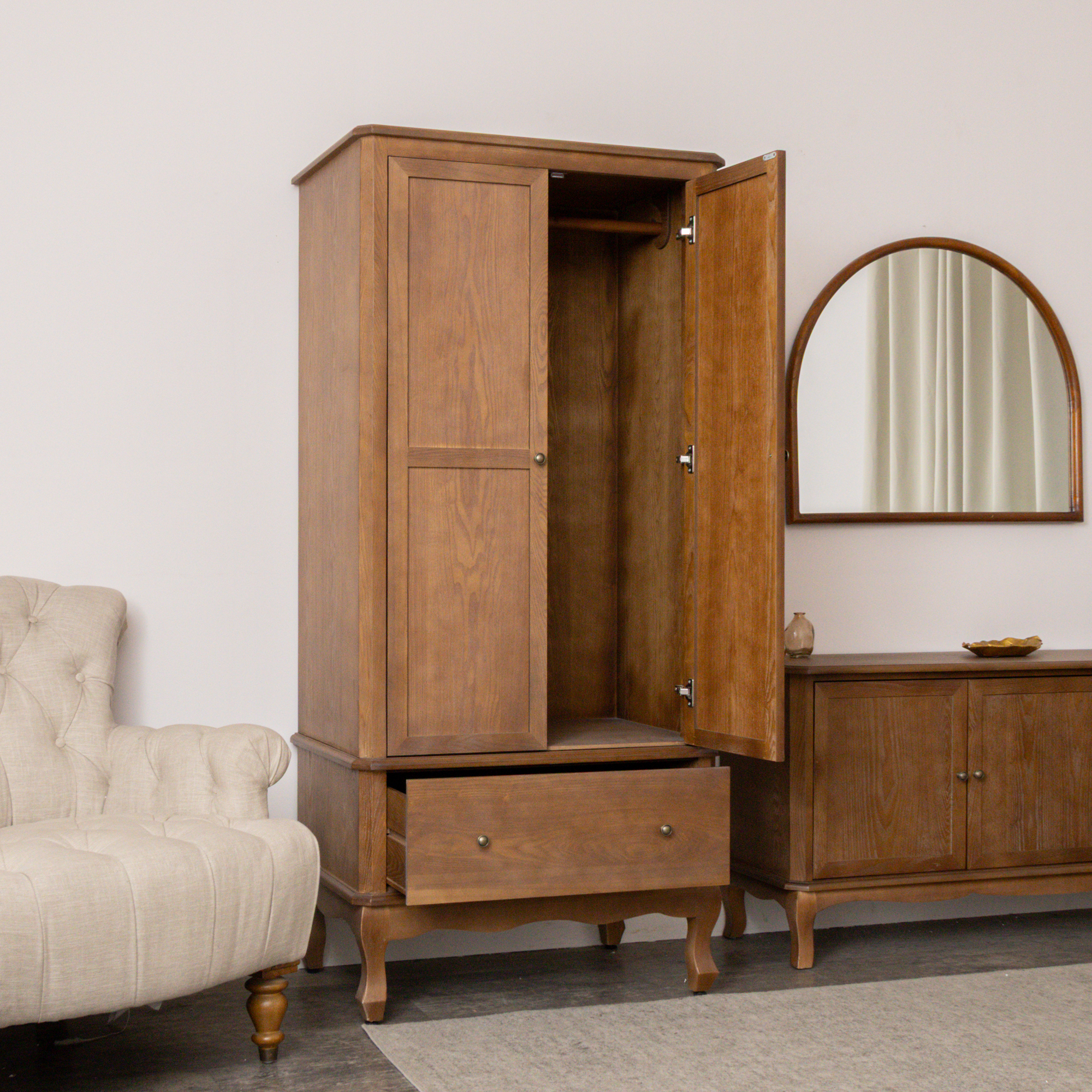 A stunning wardrobe that could be the perfect addition to a bedroom space. Due to its natural wooden finish this versatile wardrobe could fit perfectly into modern, boho, farmhouse or vintage inspired interiors.