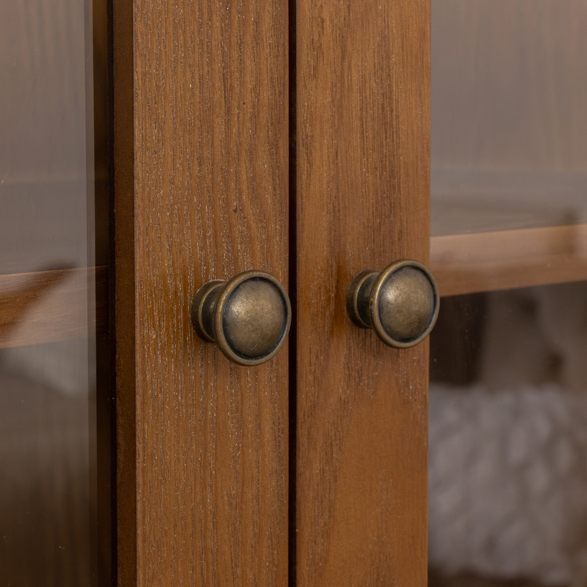 This Tall Freestanding Wood Display Cabinet from the Ashwell Range is a bold, wooden storage option, perfect for mounting in a kitchen or hallway space. Crafted from wood, glass and metal, this cupboard has a double door design and comes with clear glass frontage.