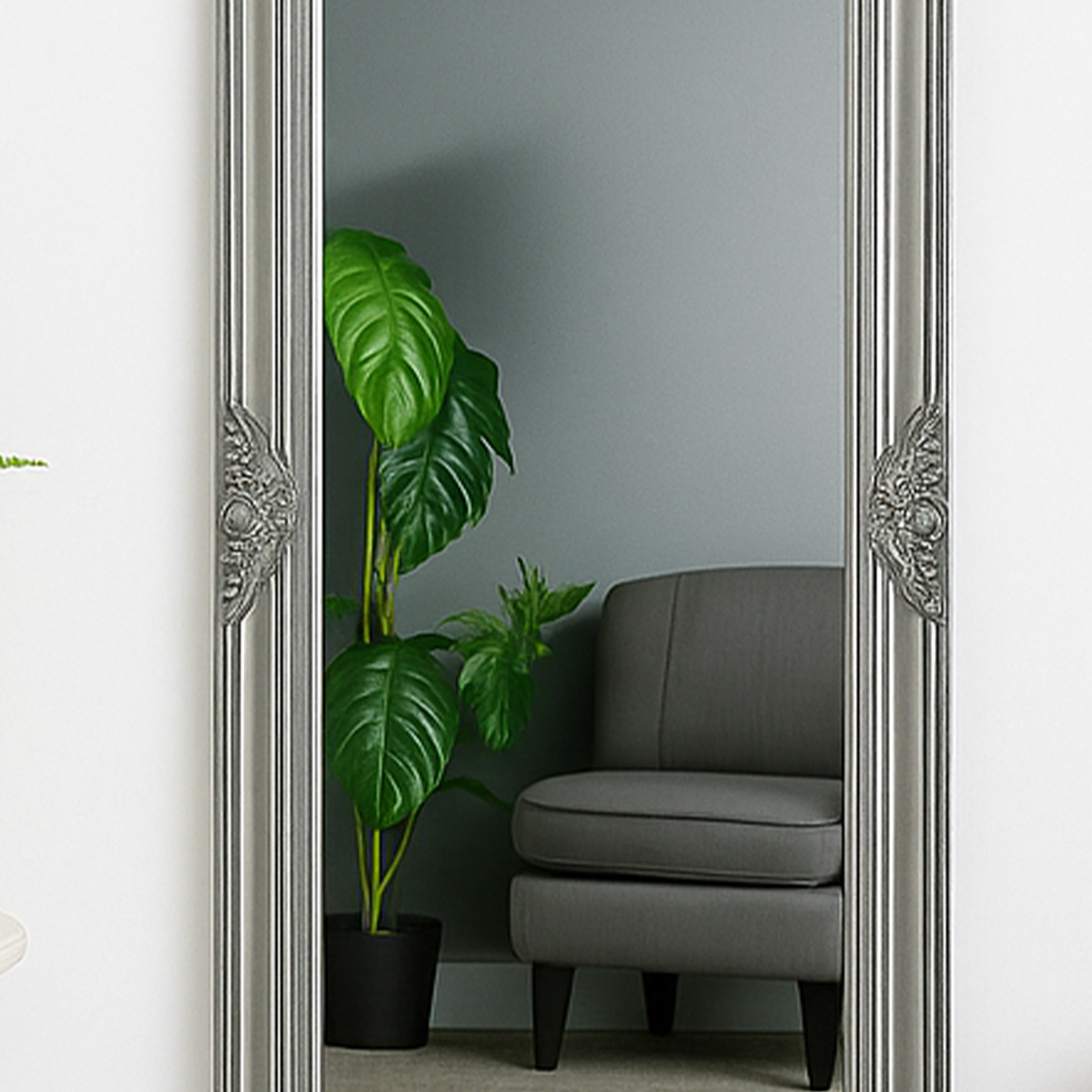 Tall Silver Ornate Mirror 47cm x 142cm x 3.5cm (width x height x depth). A stunning and imposing silver effect ornate framed mirror. This silver ornate framed mirror is made from wood and resin , has an aged finish and bevelled mirrorA gorgeous silver mir